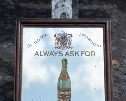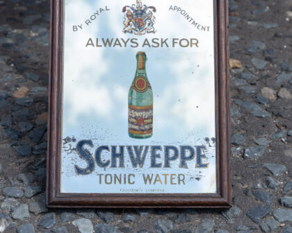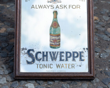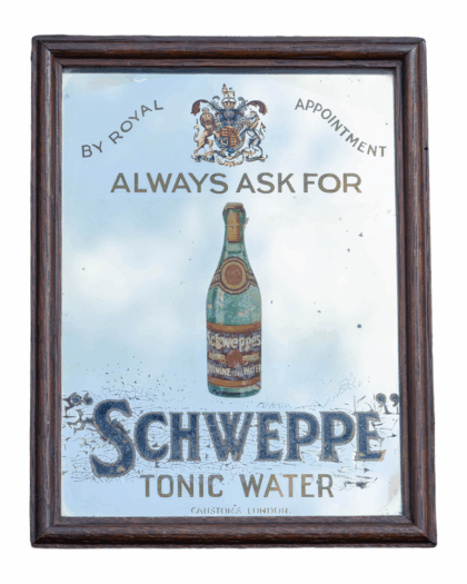 Vintage Schweppes Tonic Water advertising mirror. This decorative mirror features a dark wood frame and a vintage advertisement for Schweppes Tonic Water. The design includes the Schweppes logo, a bottle illustration, and the phrase 'Always Ask For' along with 'By Royal Appointment' . The mirror glass shows signs of age, adding to its vintage charm. There are some areas of damage, as would be expected with a vintage item. Ideal for a home bar, kitchen, or as a unique decorative piece, this mirror brings a touch of vintage flair to any space. A perfect piece of advertising and breweriana.