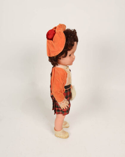 This is a vintage doll dressed in a traditional Scottish tartan skirt and an orange jacket, complete with a matching hat. The doll has a plastic face and limbs, with brown curly hair. The skirt is a red and green tartan pattern with a black waistband. A small white fur muff is also included. The doll is in its original cardboard box. Signs of age, wear and tear are visible on the doll and the box. Overall the doll has a vintage charm and could be displayed in a children's room or in a collection.