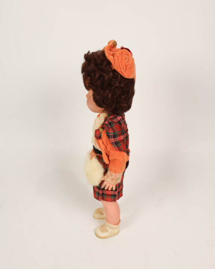 Vintage doll in original box. Dressed in tartan skirt and orange jacket. Shows signs of age, wear and tear.