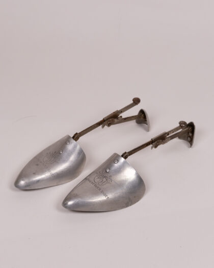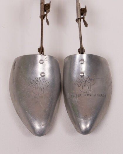 This is a pair of vintage Selberite Arch Preserver shoe stretchers. Made in England. Crafted from cast aluminium, each stretcher features a sprung mechanism at the heel for maintaining shoe shape. The metal components have age-related wear and tarnishing. These shoe stretchers are not just functional tools but also interesting collectibles for shoe enthusiasts or those interested in vintage accessories.