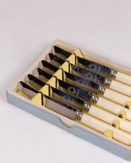 A set of six vintage Sheffield stainless steel knives, each with cream-coloured plastic handles. The knives are marked 'STAINLESS SHEFFIELD ENGLAND' and have decorative detailing. They come in their original light blue cardboard box with yellow insert. The knives show signs of wear consistent with age and use, including some scratches and marks on the blades. The box also has some wear and tear, including scuffs and marks. Overall, this is a charming vintage set perfect for adding a touch of retro flair to your dining table.