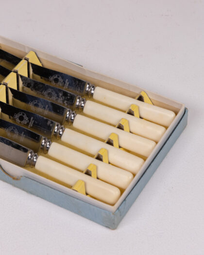 Sheffield stainless steel knives set of 6 with cream handles in original blue box. Good condition, signs of age related wear.