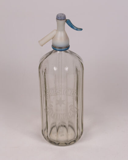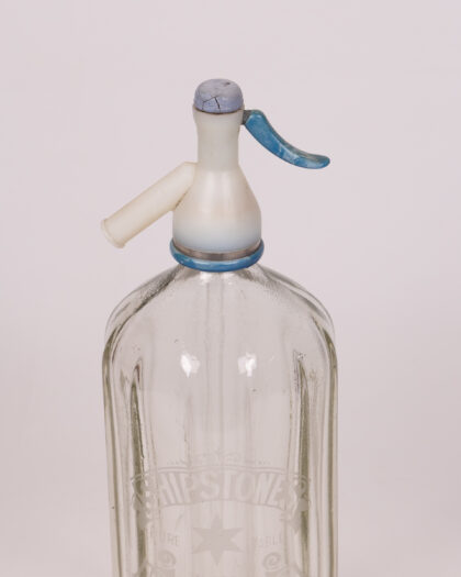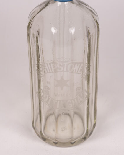 Vintage Shipstone's clear glass soda siphon bottle from Nottingham with blue handle and detailing. Good condition. Perfect home bar decor.