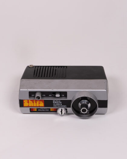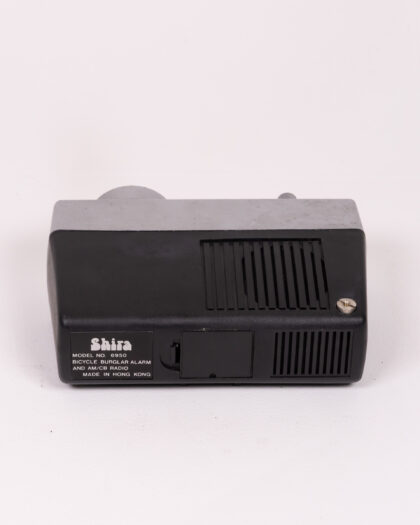 Vintage 'Shira' bicycle burglar alarm & AM/CB radio, Model 6950, made in Hong Kong. Black & Silver finish. Unique vintage electronics.