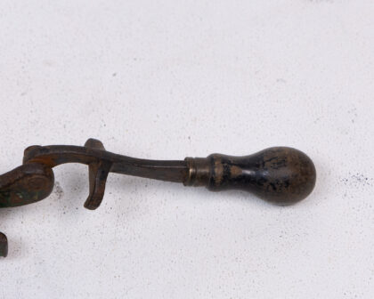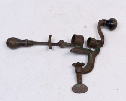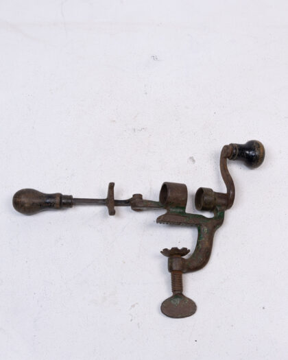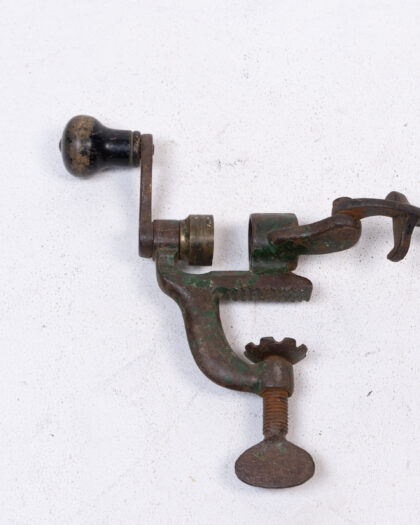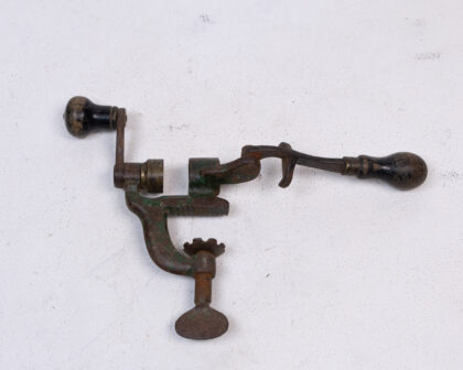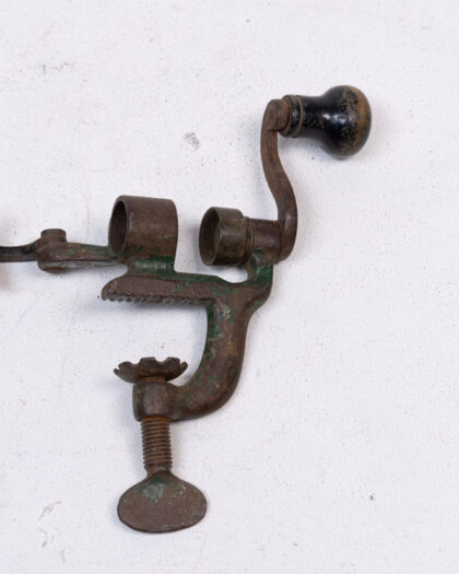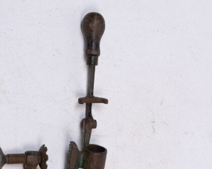 Vintage shotgun cartridge maker tool. Metal and wood construction with green paint remnants. A unique gift for collectors, good condition.