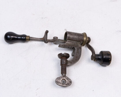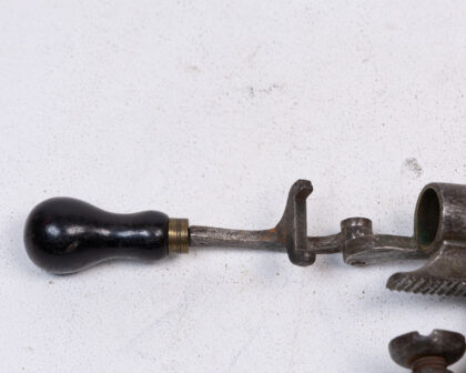 Vintage shotgun cartridge maker with weathered metal, brass, and black wood handles. Great for collectors, man caves, or unusual décor.