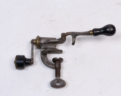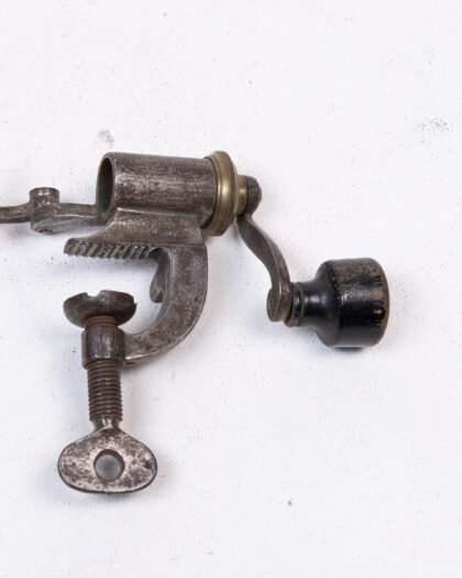 A vintage shotgun cartridge maker. This mechanically intriguing tool features a weathered, tarnished grey metal body accented with brass fittings, adding a touch of antique charm. The handles are crafted from black wood, providing a comfortable grip. A clamp secures the maker to a work surface. While showing signs of age and use, it remains a fascinating piece of history, perfect for collectors or enthusiasts of vintage tools. All moving parts appear functional, but sold as a display item only. A great decorative item for a man-cave.