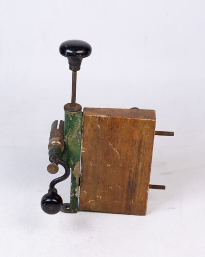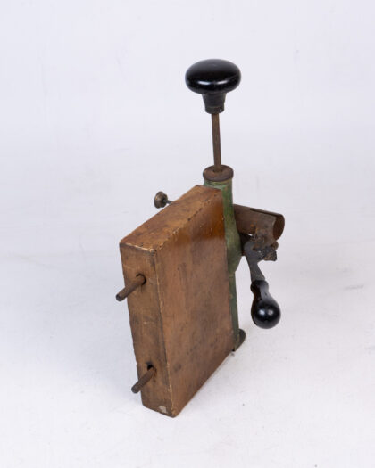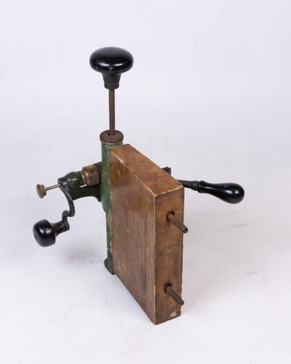 This is a vintage tool for making shotgun cartridges. The device is constructed with a wooden block as a base, with painted green metal components attached. It features black, round handles, and various levers and adjustments. The metal parts show signs of age and use, with some rust and wear to the paint, giving it a rustic appearance. The wooden block is aged and has wear. Ideal for collectors or as a decorative item.