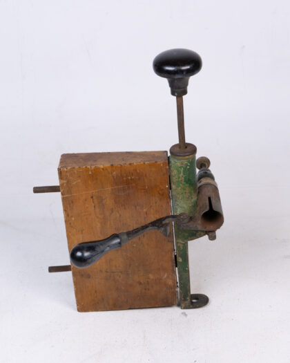 Vintage shotgun cartridge maker tool with wood and metal construction. Rustic appearance, ideal for collectors or decor.