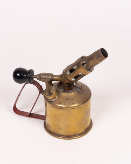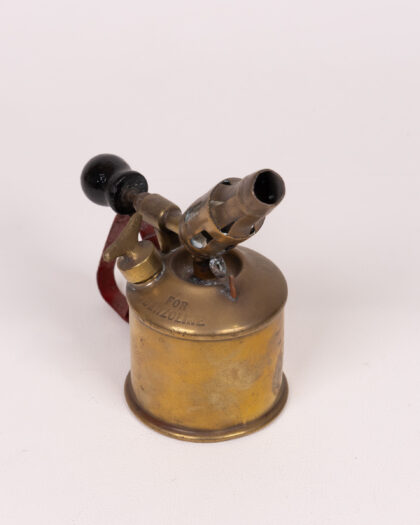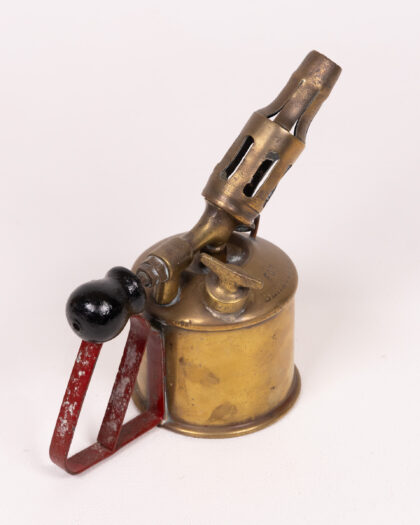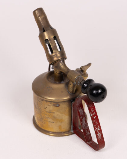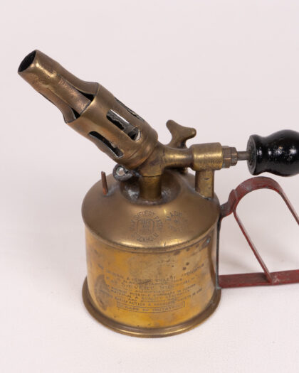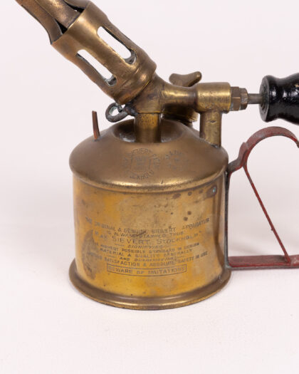 Vintage Sievert blowtorch with brass body, red metal handle, and black knob. A unique tool with signs of wear, perfect for collectors.