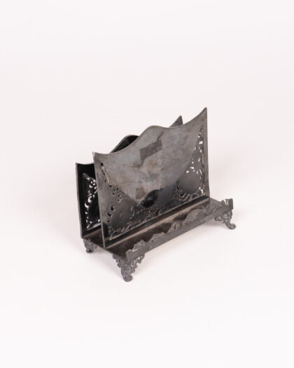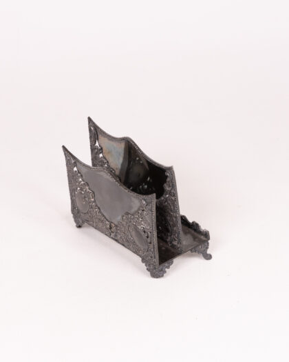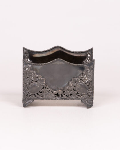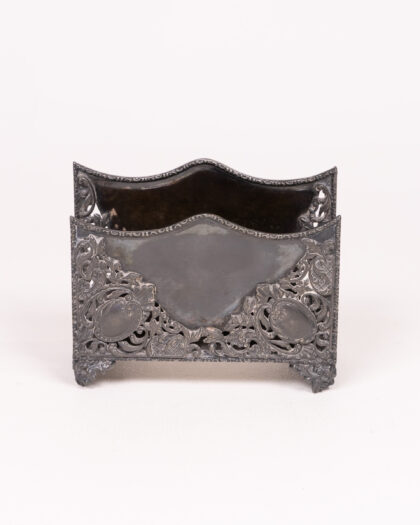 This ornate letter holder features a highly decorative design. The metal has been worked to create a pierced, filigree effect. There are decorative panels on the side, adding to the intricate overall design. Would add a touch of vintage charm to any desk or hallway table. The design suggests a vintage or antique origin, adding to its unique appeal. The item is sturdy and functional, perfect for keeping letters and small documents organised.
