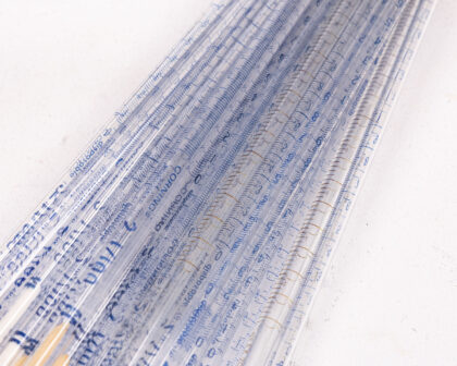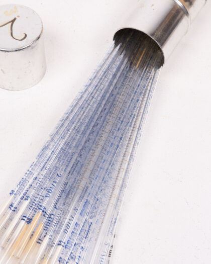 This is a vintage metal cylindrical container, possibly aluminium, designed to hold scientific pipettes. The container features a removable lid marked with the number '2'. The container has visible wear, including scratches and some discolouration. A blue line marks the location where the lid meets the cylinder. Inside, the container is filled with disposable glass pipettes. The pipettes have blue graduation markings and appear to be unused. This item would be suitable for display as a vintage scientific item or for use in a scientific or educational setting.