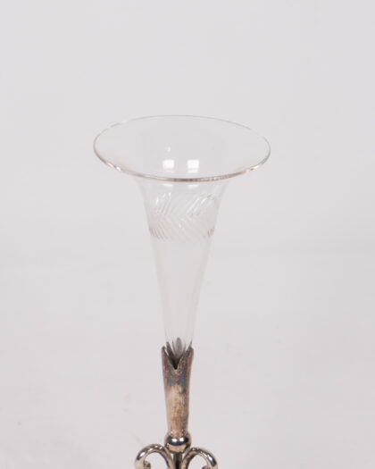 Elegant silver plated and glass trumpet vase. Some wear consistent with age. A lovely display piece for any home.
