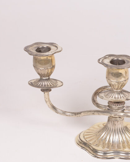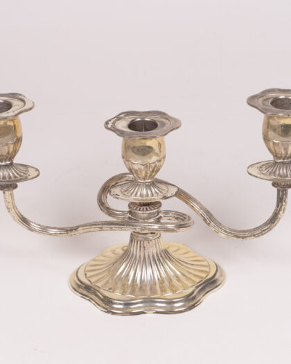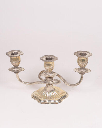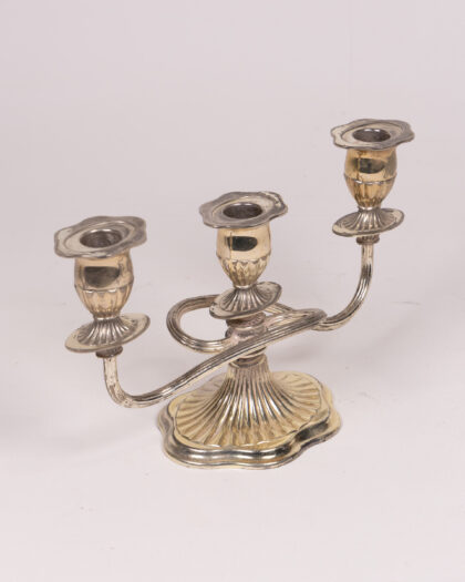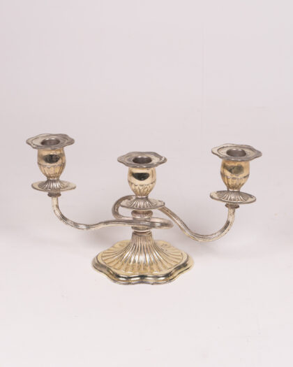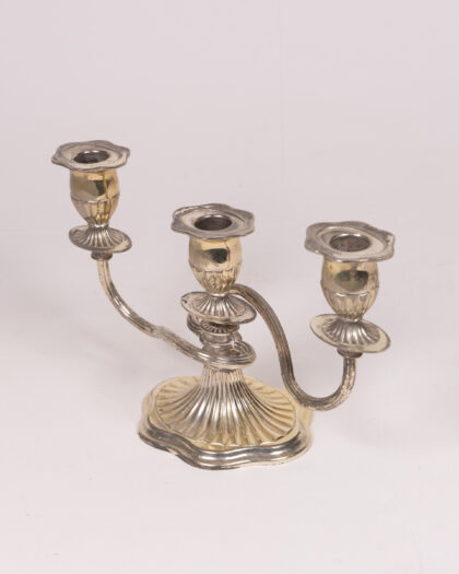 Vintage silver-plated candelabra for three candles. Elegant design with fluted base and candle holders. Aged patina adds charm. Ideal for home decor.