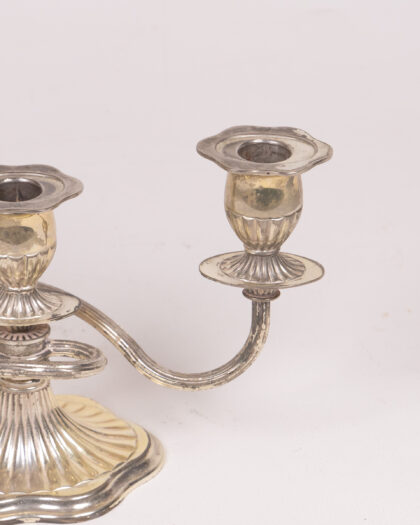 A vintage silver-plated candelabra designed to hold three candles. It features a fluted base with a decorative edge and curving arms connecting the base to the candle holders. The candle holders are also fluted with a petal-shaped rim. The silver plating shows tarnish and wear, giving it an aged patina. The piece has a classic, elegant design that would complement a variety of interior styles. Please note there are signs of age and wear.