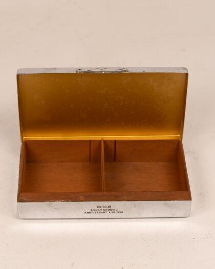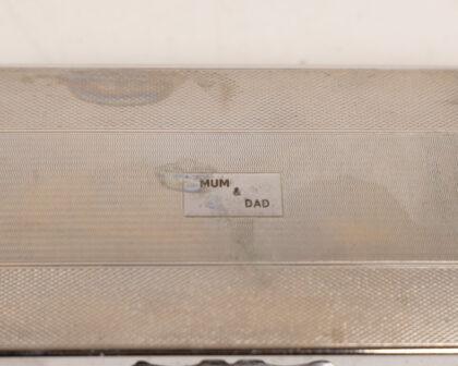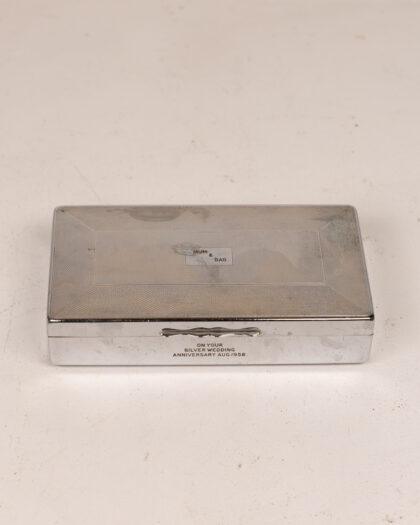 A vintage silver-plated box engraved with 'Mum & Dad' and dated August 1958, ideal for collectible enthusiasts.