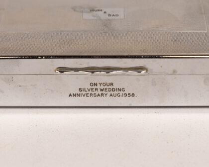 This exquisite vintage box features a silver-plated finish and is engraved with 'Mum & Dad' on the top. The side of the box commemorates a silver wedding anniversary dated August 1958. Its elegant design and historical significance make it a perfect addition to any collection of memorabilia. The box is in good condition with some signs of aging, adding to its charm and authenticity.