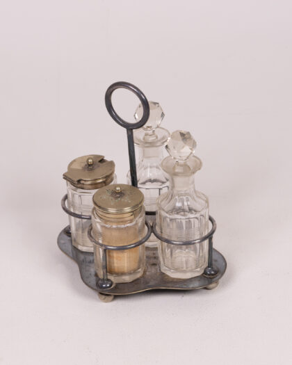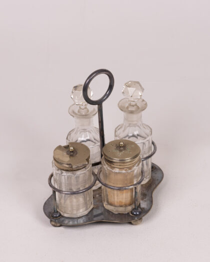 Vintage condiment or oil and vinegar set. This set comprises four glass vessels on a silver plated stand. There are two bottles with crystal stoppers, for oil and vinegar. The other two jars have ornate metal lids and would have been used for mustard, salt or pepper. The stand is silver plated with an ornate scalloped edge, raised on four bun feet and with a central ring handle. The set has a vintage aesthetic and would be a beautiful addition to any table setting. There are signs of tarnish on the metal and some clouding to the glass, commensurate with age.