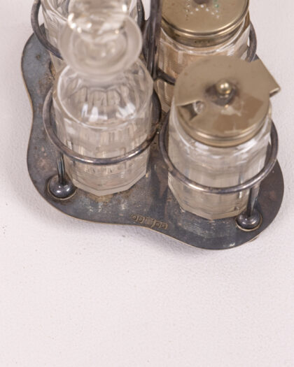 Vintage condiment set with crystal stoppers & silver-plated stand. An elegant addition to the dining table. Some tarnish. See description.