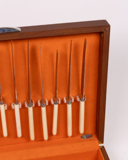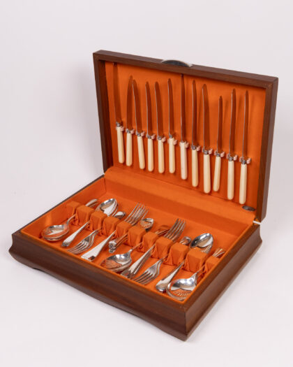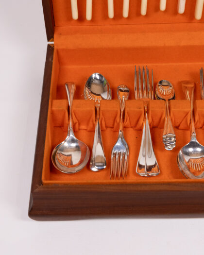This is a complete vintage cutlery set housed in a wooden box. The set features silver plated forks, knives, and spoons, all neatly arranged in the box. The handles of the cutlery are ivory-coloured. The interior of the box is lined with orange fabric, providing a striking contrast with the silver cutlery. The wooden box itself is in good condition, with a smooth finish and minimal signs of wear. The cutlery pieces are well-preserved, showing only slight signs of use consistent with age. A sophisticated addition to any dining room.