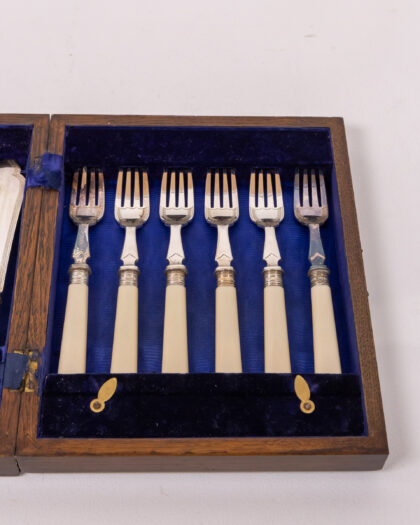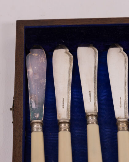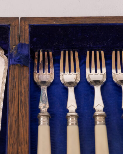 A vintage cased set of silver plated fish set cutlery, comprising of six knives and six forks. The cutlery has cream coloured handles and ornate silver plated tops. All pieces are housed in their original wooden presentation case with a navy blue velvet lining and clasps. The case is in good condition, with some minor wear commensurate with age. There is some tarnish to the silver plate.