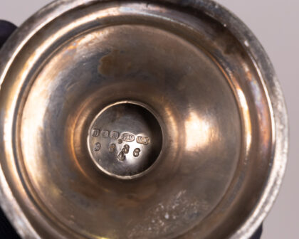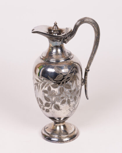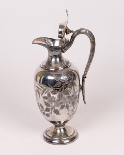This is a vintage silver jug, possibly electroplated nickel silver (EPNS), featuring an ornate handle and a hinged lid. The body of the jug is decorated with engraved floral patterns, adding to its overall aesthetic appeal. The item is stamped on the base with "D&A EP BM 9886". Overall, this jug presents beautifully, however, there is tarnish and wear consummate with age. This does not detract from the beauty of the piece, but provides it with an authentic vintage feel.