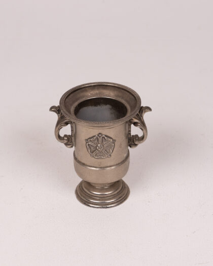 Vintage 'Made in England' silver-plated miniature cup/trophy with rose emblem & handles. Wear consistent with age adds to its vintage charm.