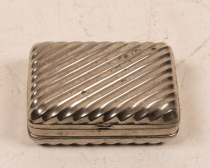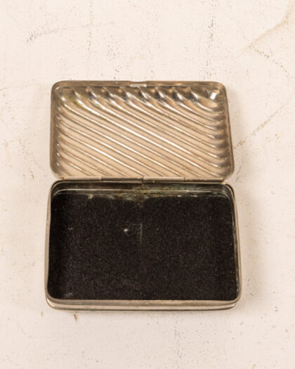 Vintage silver plated pill box. The box is rectangular with a ridged design. The inside of the box is lined with black felt. There is some tarnishing and wear consistent with age. Ideal for carrying small items or as a decorative piece.