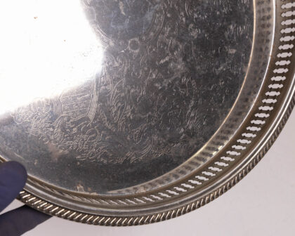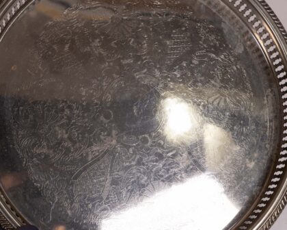 Elegant silver-plated serving tray with ornate design. The tray's surface showcases detailed floral and geometric engravings, enhancing its vintage charm. Perfect for serving drinks or displaying decorative items, this piece combines functionality with aesthetic appeal. While the tray exhibits some signs of wear consistent with age and use, including light surface scratches, it remains in good condition overall, ready to grace any home or event with its timeless beauty.