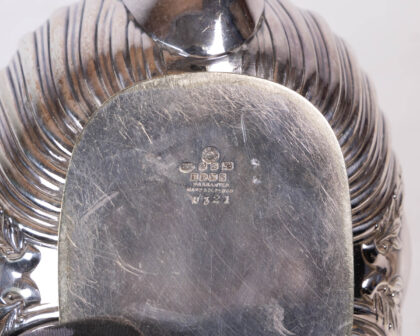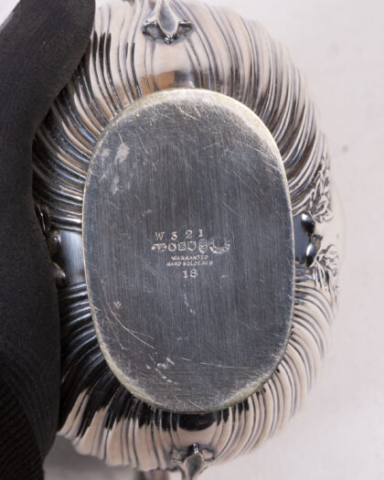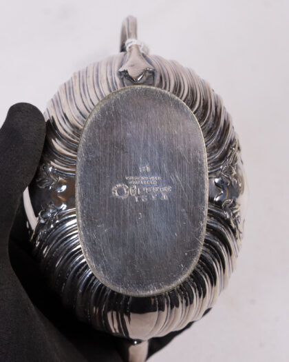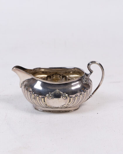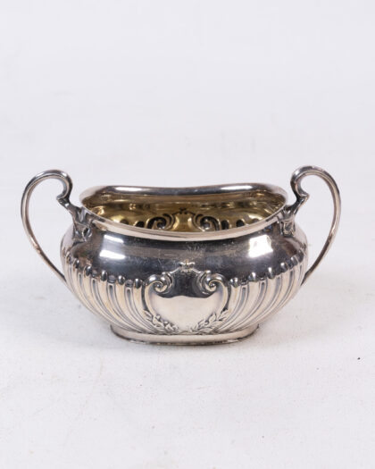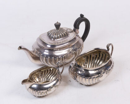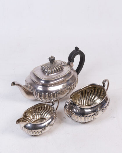 Vintage Silver Tea Set featuring ornate ribbed detailing, including a Teapot, Sugar Bowl, and Creamer.