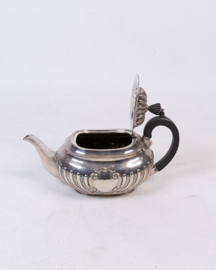 This is a vintage silver tea set, including a teapot, a sugar bowl, and a creamer. The teapot has a square body with a ribbed design and a black handle. The sugar bowl and creamer are also silver, with an ornate ribbed design and a pouring spout. This set will make a beautiful addition to your dining table. The silver is tarnished in places, commensurate with age.