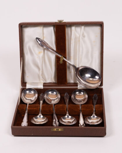 Cased set of 6 silver plated tea spoons and sugar ladle. Elegant design, some age-related wear. Perfect for adding vintage charm.