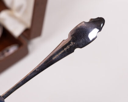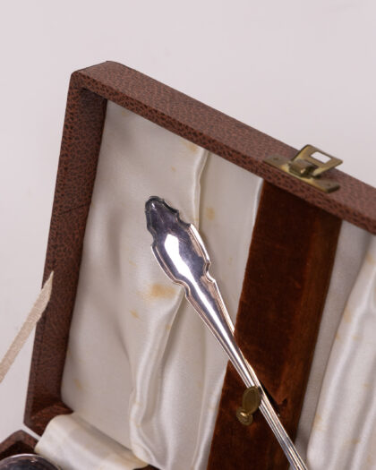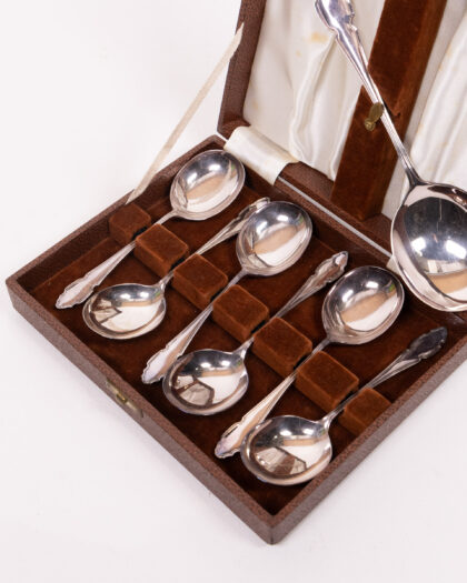 This vintage set includes six silver plated tea spoons and a sugar ladle, presented in a fitted box. The spoons feature a decorative handle design. The set shows some signs of age and use, including light scratches and tarnishing, which adds to its vintage character. The box is lined with satin and velvet, with some staining on the satin. This set would make a lovely addition to any tea set, bringing an air of elegance to any tea party.