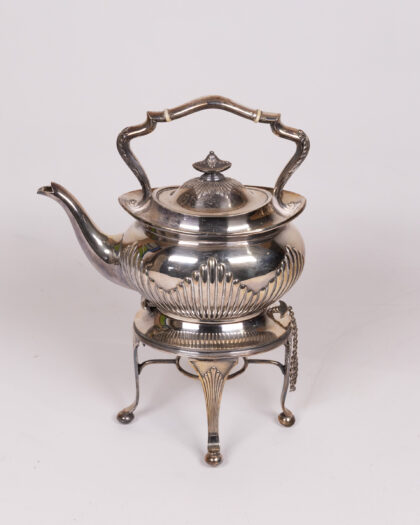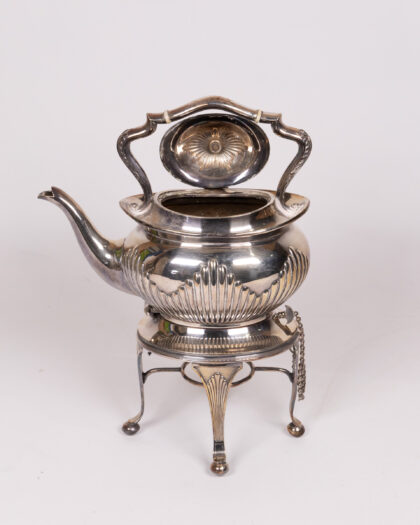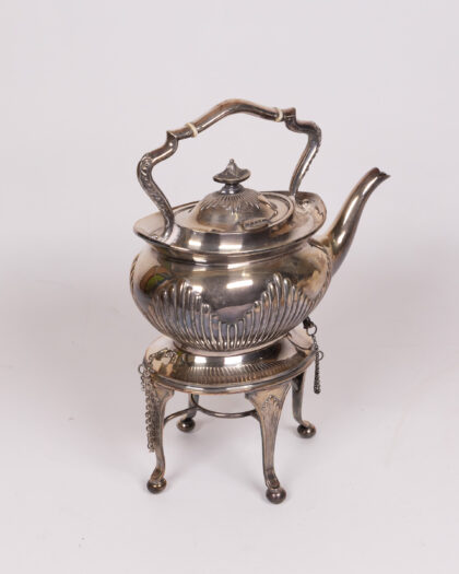 Elegant silver plated teapot with ornate detailing and a matching stand. This vintage piece features a bulbous body with ribbed accents, a curved spout, and an intricately designed handle. The stand has four elegant legs and a delicate chain detail. The teapot lid has an ornate finial. The piece shows signs of age-related wear, including minor tarnishing and surface imperfections, which add to its antique charm. The base of the stand is marked with manufacturer details. The interior may require cleaning depending on intended use.