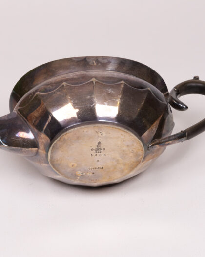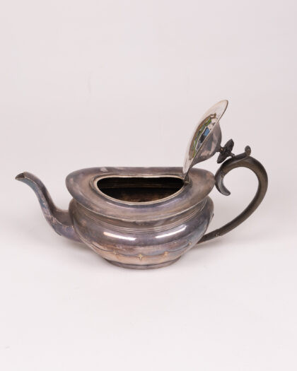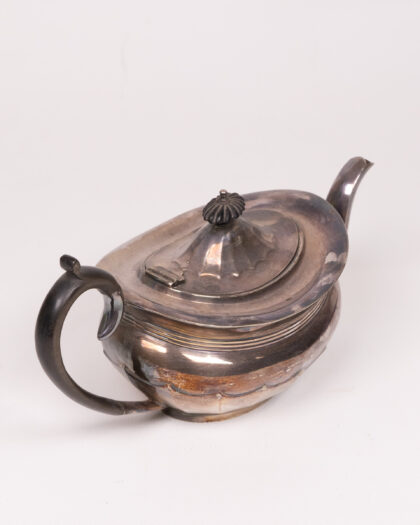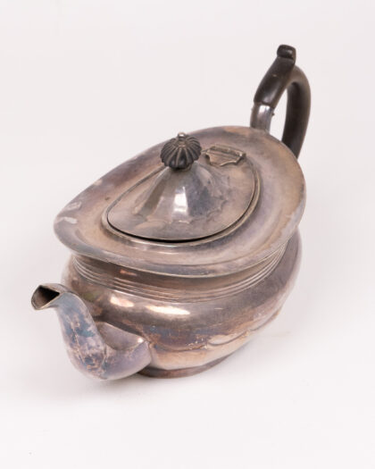 Vintage silver teapot with a distinct design. Some tarnishing and wear; still a beautiful piece for collectors and tea enthusiasts alike.