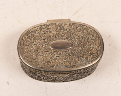 Charming vintage trinket box featuring an oval shape and ornate floral embossed design. The box is silver plated and lined with a vibrant red velvet interior. This piece shows some signs of age, enhancing its vintage appeal. Perfect for storing jewelry or small keepsakes, adding a touch of elegance to any dressing table or shelf.