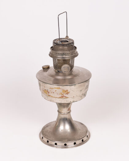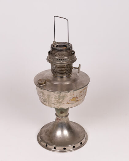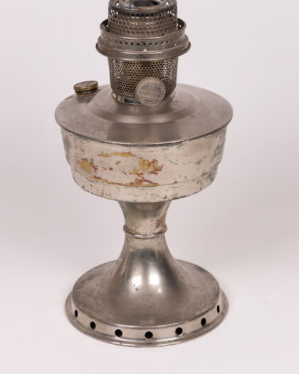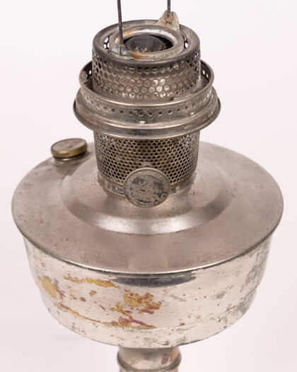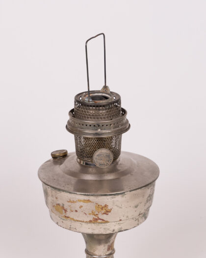 Vintage silver tone metal oil lamp with mesh burner assembly. Decorative and tarnished – a beautiful piece for collectors and home decor. Missing glass chimney