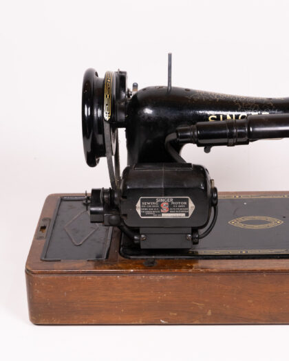 Discover this authentic Vintage Singer 99K sewing machine, a classic piece of engineering and design. This machine features a striking black finish with elegant gold detailing and the iconic Singer logo, resting securely on its original wooden base. It comes complete with its original black Singer sewing motor mounted to the side and includes the essential foot pedal, making it ready for use. Despite its age, this Singer 99K remains in very good working condition, showing only minimal wear consistent with its vintage status, primarily some charming wear on the gold leaf and paint that adds to its character. The serial number EJ719005, indicating its precise manufacturing period, is clearly visible on the machine's bed. It is housed in its distinctive original alligator-embossed case, perfect for storage and transport. This machine is not just a functional tool but also a beautiful display piece for any home or creative space.
