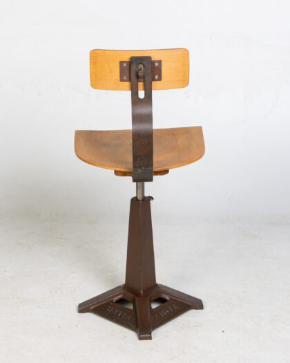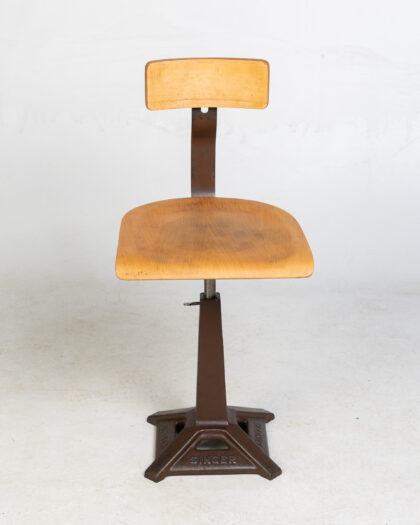Vintage Singer industrial chair with a cast iron base and adjustable wooden seat. A unique piece of industrial history.