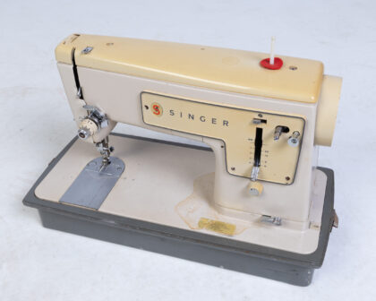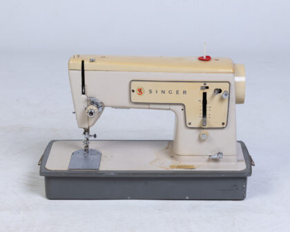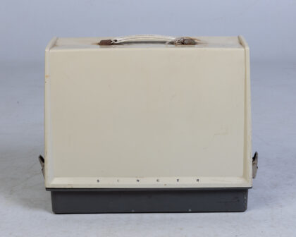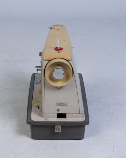 Vintage Singer sewing machine in beige and cream with grey carry case. Perfect for collectors or sewing enthusiasts.