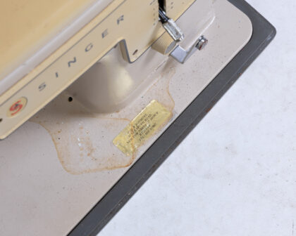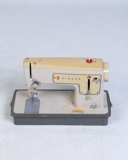Vintage Singer sewing machine in beige and cream with a grey carry case. The machine shows signs of age, with some discolouration and wear on the base and body. Includes a foot pedal and a red bobbin thread spool on top. Features various dials and settings typical of Singer sewing machines of the era. A sticker is present on the base, indicating a previous owner or service. Complete with carry case.