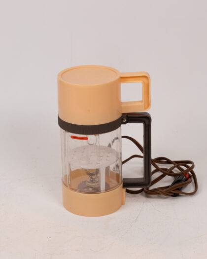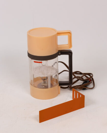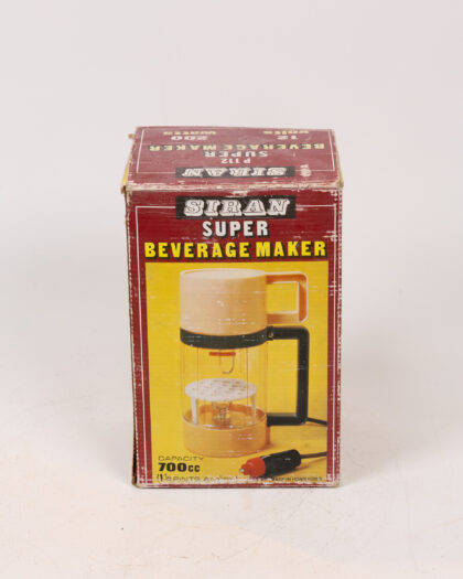 Vintage Siram Super Beverage Maker P112 in original box. Made in Hong Kong. The beverage maker is made of plastic and glass with a brown handle. Includes orange stand piece. The box is cardboard with graphics of the product. The item is untested and sold as is. The box shows wear including scuffs, tears, and creases. Please see photos for condition and detail.