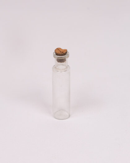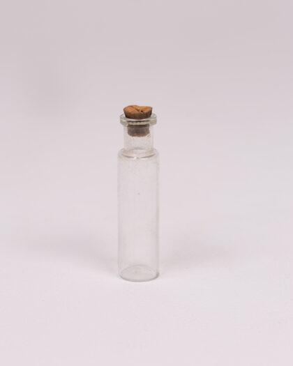 A petite vintage glass bottle with a simple, cylindrical body. It features a narrow neck and is sealed with a small brown cork. The glass is clear, allowing visibility of the contents, if any. The bottle has a clean and minimalist aesthetic, perfect for displaying dried flowers or as part of a vintage collection. The bottle shows some signs of age, adding to its vintage appeal.