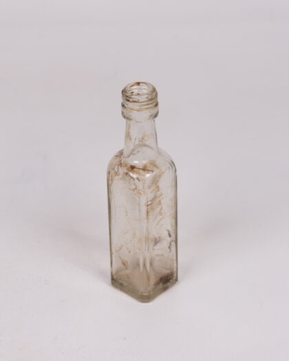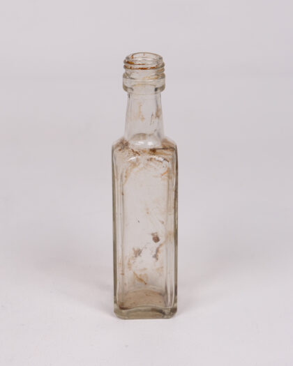 Small vintage clear glass bottle. Features a square base and a narrow neck, suitable for liquids or decorative purposes. Shows signs of age and wear, adding to its vintage charm. The bottle is clear glass with some internal residue. Would be ideal as a bud vase or decorative item.