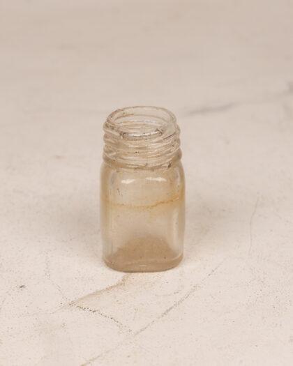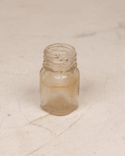 This is a small clear glass jar, likely dating back to the mid-20th century. The jar features a simple cylindrical body with a slightly rounded base and a short, ribbed neck. The glass is clear, although there are some traces of residue inside, suggesting it was previously used for some kind of product, likely a medical or scientific compound. Condition is good, with no cracks or chips visible. This jar could be used for storing small items, display, or as part of a collection of vintage glass bottles. 6.5cm high