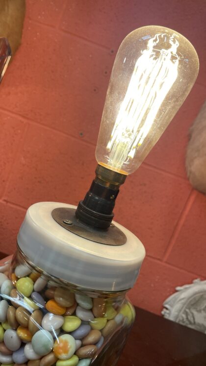 Vintage sweet jar filled with Smarties, and wired as a very desirable and colourful table lamp.