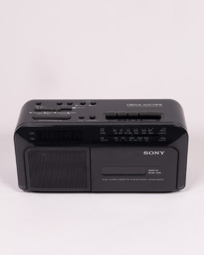 Vintage Sony Dream Machine dual alarm cassette player digital clock radio. A classic piece of electronic nostalgia. Features a digital display, AM/FM radio, cassette player with controls for play/standby, FF, and Rew. The item is in good condition. There are some minor surface scratches as can be expected with age. It offers a blend of functionality and retro design. A great item for any collector.