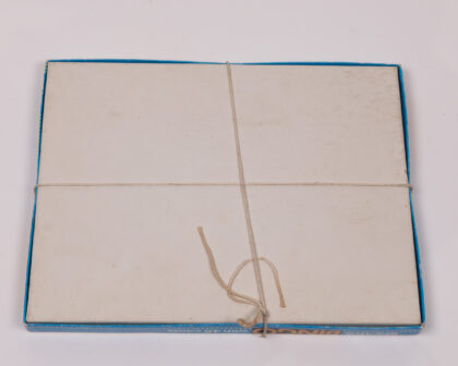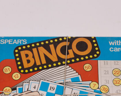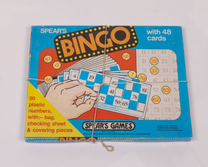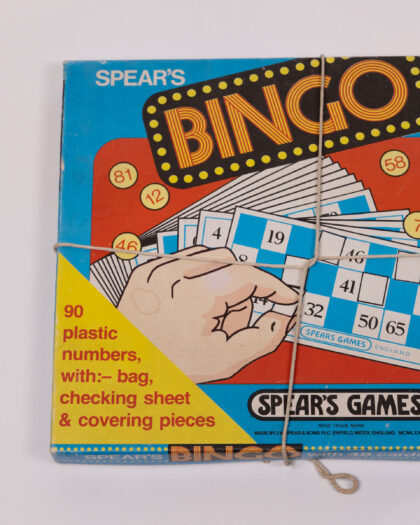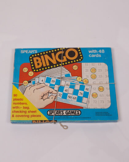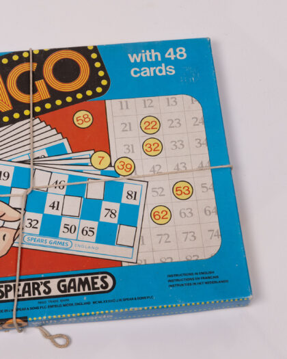 This is a vintage Spear's Bingo game, complete with 48 cards, 90 plastic numbers, a bag, a checking sheet, and covering pieces. The box features a blue background with red and yellow accents and the 'Bingo' logo in a fun, retro style. The game includes bingo cards with a traditional number layout, adding to the vintage charm. Instructions are written in English, French and Netherlands. The box is tied up with string. A nostalgic and entertaining addition to any game collection. Would make a great gift for a family.