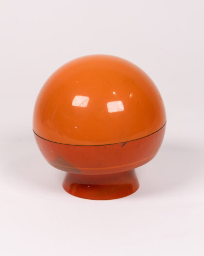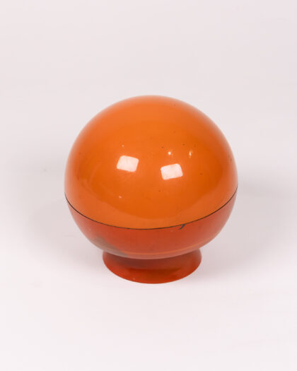 This is a vintage spherical box with a stand. It is composed of two halves that fit together to form a complete sphere. The top half is a bright orange, while the base and stand are a darker red-orange. The inside of the base is black. This unique decorative item shows wear consistent with its age and use. It has some light scratches and scuffs on the surface, which add to its vintage character. It would work well as a trinket box for storing jewellery or other small items, or simply as a decorative item.