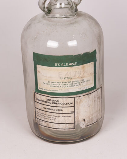 Vintage St. Albans essence flavouring preparation bottle. This 5 litre glass bottle features a red plastic cap and has labels on the front indicating it once contained flammable liquid. The labels are peeling off, and there is some staining inside the bottle. Bottle manufactured February 19, 1987.